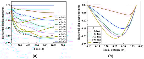 Figure 7a shows the variation curve of horizontal displacement with time on section A. It can be seen from the figure that the horizontal displacement values at different positions increased with time. Before 200 days, the horizontal displacement values of all location points rapidly increased, but the increase varied depending on the distance from the hydraulic boundary. The closer the hydraulic boundary was, the more the horizontal displacement value increased. After 200 days, the growth rate of all location points slowed down and eventually reached equilibrium.
