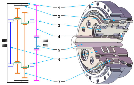Motion diagram of the RV reducer: (1) pin housing; (2) pin; (3) crankshaft; (4) planet gear; (5) gear shaft; (6) flange; and (7) cycloidal gear.