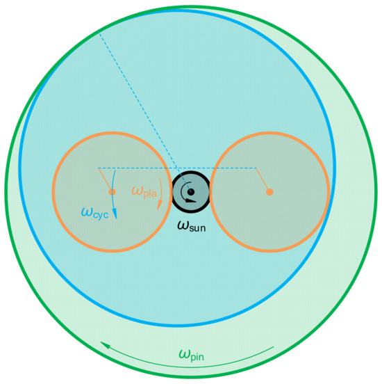 The error influence in the cycloidal gear exhibits two characteristic frequencies. Firstly, these errors complete a full cycle with each engagement with the pin gear, considering the cycloidal gear’s counter-rotation (see Figure 3), resulting in a characteristic frequency of (fpla + fcyc). Secondly, these errors complete a full cycle per self-rotation of the cycloidal gear, with a characteristic frequency of fcyc.