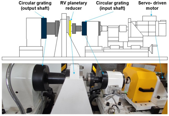 The ZFUN ZRT-II reducer testing system, as depicted in Figure 4, was utilized to evaluate two distinct types of RV reducers. The angle sensor employed was a HEIDENHAIN ERA4282C series circular grating, and the data acquisition system utilized an NI-R series PCI-e7842 acquisition card. The reducer was mounted on the test bench in a configuration with a fixed pin housing, with input provided through the sun gear and output through the flange.