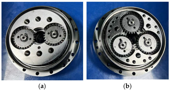 A total of 8 RV reducers were selected for the testing and analysis of TE. Prototypes 1–4 were of the 190BX-121-RVE model, which features two planetary gears and two crankshafts (as shown in Figure 5a). Prototypes 5–8 were of the 65BX-121-RVE model, which has three planetary gears and three crankshafts (as shown in Figure 5a).
