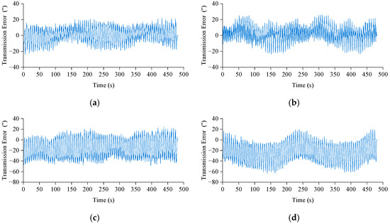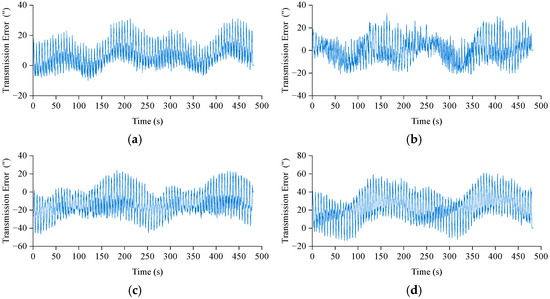 Test results of transmission error for the 190BX-121-RVE reducer prototypes: (a) prototype 1; (b) prototype 2; (c) prototype 3; and (d) prototype 4.