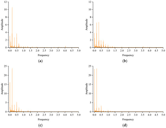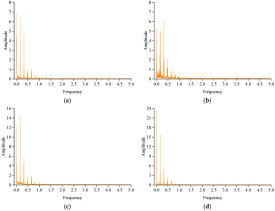 The TE spectrum analysis results for the four 190BX-121-RVE prototypes are illustrated in Figure 8. To accurately identify all the characteristic frequencies, particularly the ultra-low frequency fcyc = 0.004132 Hz, the total sampling point count for the spectral analysis was set to N = 4840. In this setting, the Fourier analysis frequency resolution is f0 = fs/N = 0.002067 Hz, approximately half of fcyc, thus allowing for the precise identification of all characteristic frequencies. From Figure 8, it can be seen that most of the TE spectral energy for the four test prototypes is concentrated in the low-frequency range (no greater than 1 Hz), with multiple high-amplitude responses within this range. Beyond the 1 Hz range, the amplitude response is minimal and can be ignored. Excluding the trend term (0 Hz), the high-amplitude response frequencies of the test prototypes are distributed at approximately equal intervals, with an interval around fpla = 0.1612 Hz.