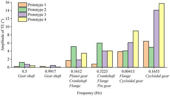 As observed in Table 7 and Figure 9, there is a distinct TE response at the two characteristic frequencies corresponding to the sun gear, 0.5 Hz and 0.9917 Hz, but their amplitude is noticeably smaller than at other characteristic frequencies. This suggests that the sun gear error is relatively minor and may have a limited impact on the overall TE of the reducer. Additionally, the characteristic frequency of 0.1653 Hz is primarily contributed by the cycloidal gear, indicating the impact of the cycloidal gear’s error on the meshing between the cycloidal gear and the pin gear. The results for this frequency across the four prototypes indicate that the tangential composite error of the cycloidal gear has a significant impact on the cycloid-to-pin gear meshing, with the largest error amplitude among all characteristic frequencies. Thus, ensuring high-quality cycloidal gear is essential for maintaining high transmission accuracy in RV reducers.