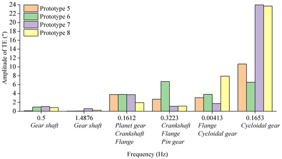 In prototypes 5–8, the response amplitude at the characteristic frequency of 0.1653 Hz is also typically the highest, further indicating the significant influence of the cycloidal gear’s tangential composite error on the overall TE. For prototype 5, the response amplitudes at characteristic frequencies 0.1612 Hz, 0.3223 Hz, and 0.004132 Hz are all around 3″, suggesting good quality in the planetary gears, crankshaft, flange, and pin gear. This also indicates good positional accuracy of the crankshaft hole on the cycloidal gear. While the transmission precision is already high, there remains room for improvement by refining the tangential composite error of the cycloidal gear. A comprehensive comparison of the results at the three characteristic frequencies (0.1612 Hz, 0.3223 Hz, and 0.004132 Hz) shows that in prototype 6, the pin gear is another component, besides the cycloidal gear, that warrants quality improvement. For prototype 7, the crankshaft, flange, and pin gear demonstrate good quality and positional accuracy, with the planetary gear exhibiting relatively notable composite errors. For prototype 8, the main reason for its subpar transmission accuracy lies in the cycloidal gear’s composite errors and positional accuracy issues with the fitting holes, indicating that these areas require quality enhancement.