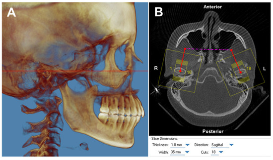 Cone-beam computed tomography (CBCT) orientation. (A) Frankfort horizontal (FH) plane constructed from the right porion and two orbitales on both sides. (B) Construction of temporomandibular joint (TMJ) slices using Dolphin software. The axis lines are perpendicular to the center of the condyles.