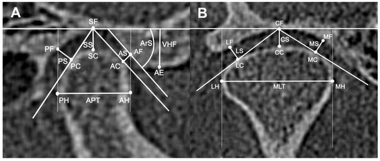 Landmarks and measurements in cone-beam computed tomography (CBCT) images. (A) Sagittal CBCT image at the greatest anteroposterior condylar head. (B) Coronal CBCT image at the greatest mediolateral condylar head. The abbreviations are as follows: AC, anterior condyle; AE, articular eminence; AF, anterior fossa; AH, anterior head; APT, anteroposterior thickness; ArS, articular slope; AS, anterior space; CF, central fossa; CS, central space; LC, lateral condyle; LF, lateral fossa; LH, lateral head; LS, lateral space; MC, medial condyle; MF, medial fossa; MH, medial head; MLT, mediolateral thickness; MS, medial space; PC, posterior condyle; PF, posterior fossa; PH, posterior head; PS, posterior space; SC, superior condyle; SF, superior fossa; SS, superior space; VHF, vertical height of fossa. AS, PS, MS, and LS were drawn at an angle of 90° from the tangent lines extending from SF and CF, respectively [4,13].