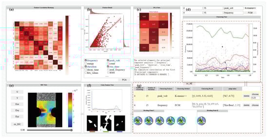 NDEExplorer’s system interface. The system is organized into the following three distinct analysis areas: the AE analysis area (a–d), the DIC analysis area (e,f), and the fusion analysis area (d,g). The blank star in (d) is the clustering center of the horizontal dotted line closest to it. And these four lines are trend lines for clustering of AE events generated based on the values of the set clustering method. The dots and dotted lines of each color correspond to same color, indicating the clustering trend of a type of AE event. The red vertical line represents the location of the damage status traced according to the Dividing Point II of (g).