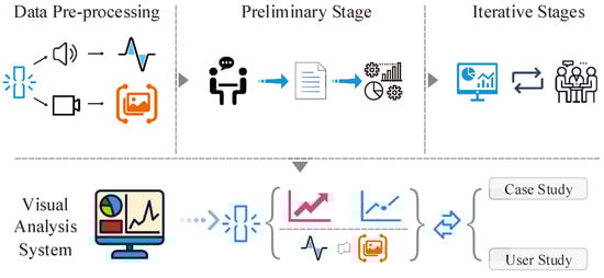 Overview of the workflow. The system workflow consists of the following four stages: first, the data pre-processing stage; followed by the preliminary stage; then the iterative stages; and finally, the completion of the visual analytics system.