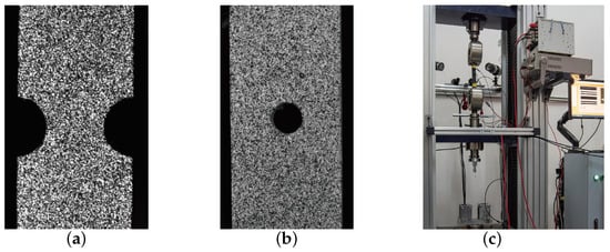 The timing and methods used for acquiring material damage information have varying degrees of impact on the results of material damage analysis. To minimize the analysis errors caused by these factors, we selected damage data from acoustic emission and image-based damage for two materials which are two-dimensional woven laminate composites with opposing morphological characteristics as follows: a concave shape on the central side (Figure 3a) and a perforated center (Figure 3b). The damage data for both materials were collected using the same testing machine (Figure 3c), employing a unidirectional tensile loading behavior. The maximum loading capacity of the testing machine used was 10 kN, and the loading rate remained constant at 2 mm/min throughout the entire stretching process.