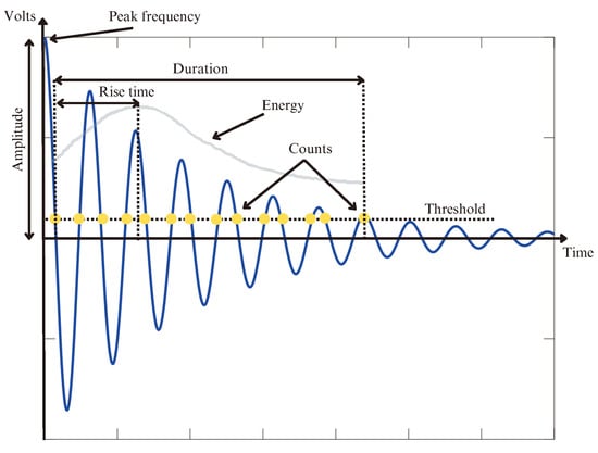 To ensure the features of the AE signal’s quality, the AE data were recorded using identical AE sensors, which were adhered to the specimen’s front surface by thermal bonding. The sensor model used was the PXR50 (Changsha Pengxiang Electronics Technology Co., Ltd., Changsha, China), a resonant-type sensor with a resonance frequency of 500 kHz and a frequency bandwidth of 300–1000 kHz. The signal amplifier model used was the PXPA3 (Changsha Pengxiang Electronics Technology Co., Ltd., Changsha, China), providing a fixed gain of 40 dB (100 times signal amplification) and a bandwidth of 4 kHz to 2 MHz. Among the most crucial equipment for AE signal collection experiments is the signal acquisition instrument, which consists of a PXI 1033 (National Instruments, Austin, TX, USA) chassis and a two-channel PXI 5122 (National Instruments, Austin, USA) high-speed digitizer board. Before AE data extraction, we conducted pencil lead breakage tests following the ASTM-E976 standards [39] to calibrate the AE measurement. The obtained AE data were continuously monitored and recorded, capturing AE signals from the application of loading to the point of material failure. We obtained sound signal features from each AE event [40,41], and, as illustrated in Figure 4, the features of individual AE events were extracted.