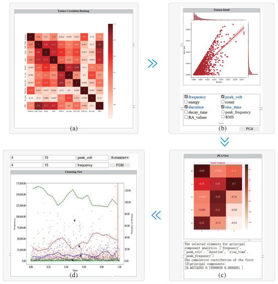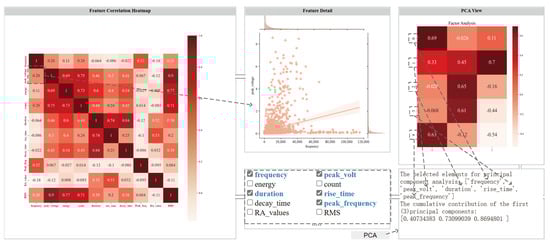 As shown in Figure 8, in the correlation heatmap view of AE data from both sides of the recessed material, the closer the value in the red blocks is to 0, the weaker the correlation between the two features, and conversely, the stronger the correlation. By clicking on a block, the AE event relationships between the two features in the feature detail view is displayed. It can be observed that features such as “peak_volt” and “RMS” exhibit a strong correlation. We select features with weak correlations for principal component analysis. By selecting AE features (frequency, duration, peak_volt, rise_time, and peak_frequency) to compare with the lower panel and clicking the PCA button, we can observe which feature is more dominant in the PCA view. As shown in Figure 8, the peak_volt feature, with a max value of 0.7 points, from both recessed materials is the most dominant. The frequency of 0.69 is closer.