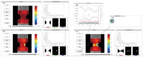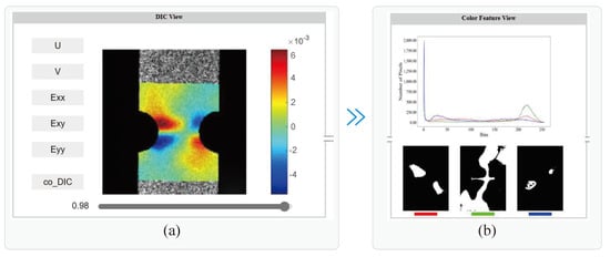 The DIC view (Figure 6a) in the system provides users with strain and displacement maps in multiple directions, allowing them to manipulate a progress bar to observe changes in the DIC images throughout the damage process, thereby facilitating an initial understanding. Subsequently, image segmentation techniques are employed to highlight regions corresponding to three distinct colors (Figure 6b), each representing a different degree of deformation as follows: severe (red), moderate (green), and slight (blue). This approach provides a more detailed representation of the damage distribution. To assist users in pinpointing the onset of damage instability, a color histogram is also displayed for the area surrounding the damage crack in each DIC image (Figure 6b). The X-axis of the histogram represents the color values, while the Y-axis indicates the frequency of each color value. The height of the histogram reflects the proportion of corresponding color pixels within the entire image. By examining the image with the most significant variation in color values, users can gain further insights into the damage details.