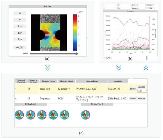 After in-depth discussions with domain experts, we determined that using AE features to define the first boundary and DIC features to define the second boundary is the most appropriate approach. Moreover, mutual validation between the two methods can further improve the accuracy of the results. The system design compares color histograms in the vicinity of the damaged crack region and interacts with the DIC damage state graphic (Figure 7a–c Dividing Point II). This triggers the appearance of a red line on the AE clustering graph (Figure 7c Dividing Point II to Figure 7b), which corresponds to the damage level, thereby enabling an AE-based validity check for the second boundary point.