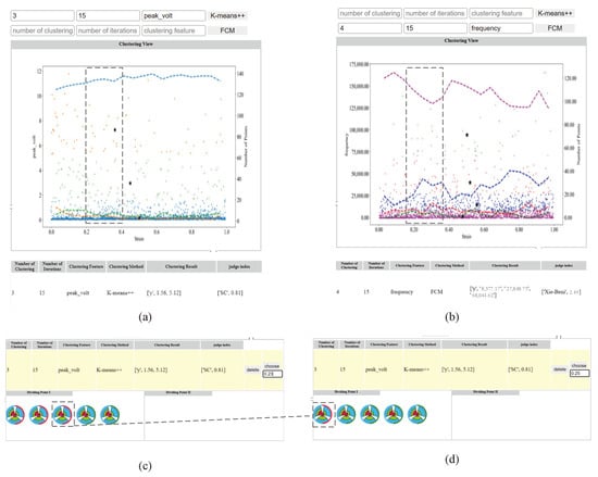 We implemented two clustering methods, one of which is the fuzzy C-means (FCM) algorithm, frequently used in previous studies. Since traditional K-means clustering is highly dependent on the selection of initial cluster centers, we also adopted another clustering method, K-means++, which improves the selection of initial centroids for the K-means algorithm. The core idea of K-means++ is that when selecting a new cluster center, the farther a point is from the existing centers, the higher the probability of it being chosen as a new cluster center. In the clustering view, the scatter plots corresponding to each category are distinguished by different colors, and we draw line graphs for the number of interval scatter plots for each category. By showing the trend of changes in the number of scatter plots for each category, potential damage patterns can be identified.
