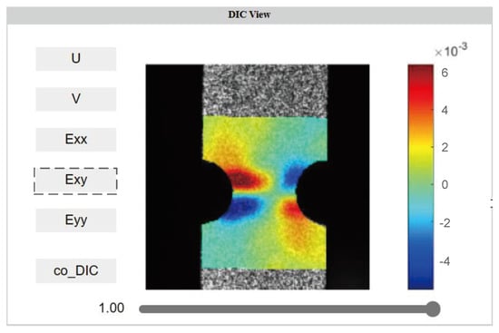 Ncorr (https://www.ncorr.com/ (accessed on 15 December 2024)) [42] is an effective software for processing the speckle images captured by the camera. After processing, it generates five displacement and strain images, namely the U, V, , , and images. Among them, U and V represent the displacement amounts in the x and y directions of each pixel, which are usually used to calculate the relative displacement difference between each point. and represent the tensile strains in the x and y directions, respectively, while represents the shear strain in the plane. By visualizing the variations in the aforementioned images, the damage progression of the material can be more effectively assessed.