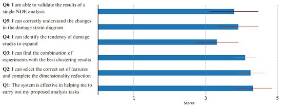 The questionnaire was designed to evaluate the usefulness of our system and to collect explicit feedback on the visual design. Using the suggestions provided by E0, we developed six questions as shown in (Figure 13) to ensure validity. We used histograms with error bars to show the mean and standard deviation of each question. Overall, all participants agreed that our system is useful for multimodal analysis tasks related to material damage (Q1). For AE analysis (Q2, Q3), the average rating for our system was 4.2 out of 5, which is very encouraging. Our participants were satisfied with the feature selection and clustering processes, and the evaluation of the DIC view (Q5) was also positive. However, there was mixed feedback on the views within the fusion analysis area (Q6), with some debate as to whether AE features should be included in a glyph design. Participants’ satisfaction with the color feature view corresponding to the damage (Q4) was low. They stated that they were not very familiar with the color feature view and somewhat misunderstood damage tracing.