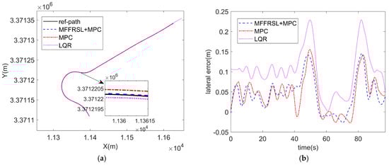 Figure 10d describes the output angles of the three controllers: LQR, MPC, and MFFRSL + MPC. The trends in angle changes during the control process in real vehicle experiments are basically the same, with differences in smoothness. MFFRSL + MPC has better smoothness than LQR and MPC. MFFRSL + MPC can correct model deviations and predictive functions and can converge errors through minor angle adjustments, avoiding overshoot and improving smoothness.