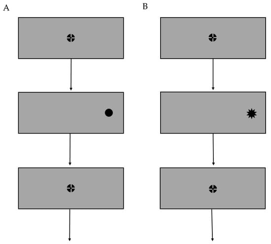 After the calibration and validation, a fixation cross appeared at the center of the screen (3 s), after which the saccadic eye movement stimulus appeared in one of four positions (up, down, left, or right) relative to the central fixation object. Saccadic eye movement stimuli were either a circle or a star (depending on the task) 0.7 degrees in size. The distance from the center of the fixation cross to the center of the saccadic eye movement target was 11.3 degrees in the vertical positions and 14.0 degrees in the horizontal positions.