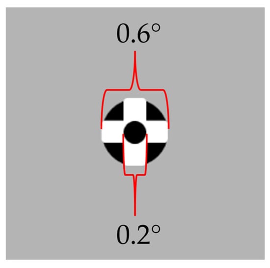In order to assess fixation stability, a fixation task was generated in which participants were required to maintain their gaze on a fixation stimulus for 10 s. The demonstrated fixation stimulus consisted of a combination of black circles (5 cd/m2, RGB (0, 0, 0)) and a white cross (180 cd/m2; RGB * (255, 255, 255)). The stimulus was displayed on a grey background (90 cd/m2; RGB (180, 180, 180) and had an overall size of 0.6 degrees (see Figure 2). The fixation task stimulus was chosen based on the study by Thaler et al. [], where this stimulus was found to provide a relatively stable fixation. After validation, a black dot appeared in the center of the screen for 3 s, after which a fixation task was presented at the same screen position. The fixation stimulus was displayed for 10 s, but the analysis of fixation included only the middle 9 s, excluding the first and last 0.5 s of the stimulus presentation. The fixation task was performed under binocular viewing conditions, meaning both eyes fixated on the stimulus simultaneously.