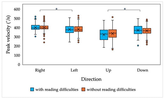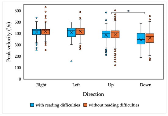 Peak velocity of reflexive saccades in children with and without reading difficulties. Data outliers significantly different from the rest of the data are marked as dots. * Statistically significantly difference (mixed ANOVA, Bonferroni post hoc analysis p < 0.05).