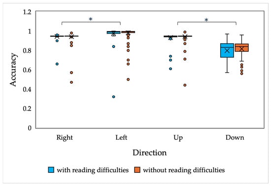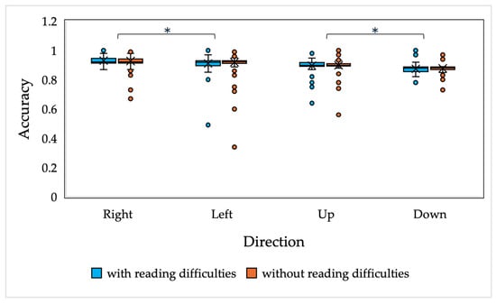 The results of the mixed repeated measures ANOVA, which determined the effects of the reading performance, age, and direction on the accuracy of reflexive saccades, only indicated a significant direction effect when comparing the horizontal (F(1; 668) = 11.182, p < 0.001, ηp2 = 0.016) and vertical (F(1; 668) = 48.658, p < 0.001, ηp2 = 0.068) saccadic eye movements (see Figure 4), but there was no significant effect of age or reading performance. Post hoc analysis revealed significantly lower accuracy results for leftward saccades than for rightward ones (Bonferroni post hoc: p < 0.001), as well as lower accuracy results for downward saccades than for upward-oriented saccades (Bonferroni post hoc: p < 0.001).