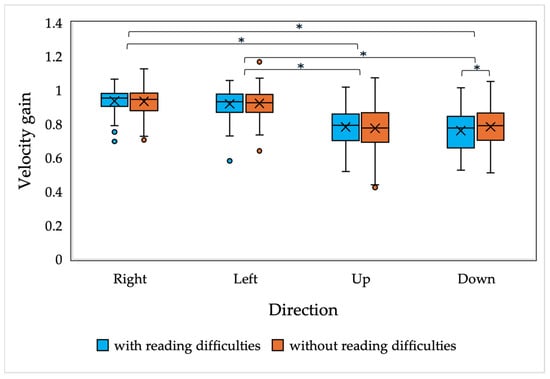 Post hoc pairwise comparisons with Bonferroni adjustments revealed significant differences in velocity gain between specific age groups: 7 vs. 8 years: p = 0.012, 8 vs. 11 years (Bonferroni post hoc: p < 0.001), 8 vs. 12 years (Bonferroni post hoc: p < 0.001), 9 vs. 12 years (Bonferroni post hoc: p = 0.025), 10 vs. 11 years (Bonferroni post hoc: p = 0.032), and 10 vs. 12 years (Bonferroni post hoc: p = 0.006). Horizontal movements (to the left and right) had higher velocity compared to the vertical movements (upwards and downwards): downward vs. leftward (Bonferroni post hoc: p < 0.001) downward vs. rightward: (Bonferroni post hoc: p < 0.001), upward vs. leftward (Bonferroni post hoc: p < 0.001), upward vs rightward (Bonferroni post hoc: p < 0.001). The analysis of velocity gain with respect to age, reading performance, and stimulus movement direction revealed a significant difference between children with and without reading difficulties, but only for 7-year-old children during downward stimulus movements (Bonferroni post hoc: p = 0.007). No significant main effects or interactions were found for the other groups or movement directions.