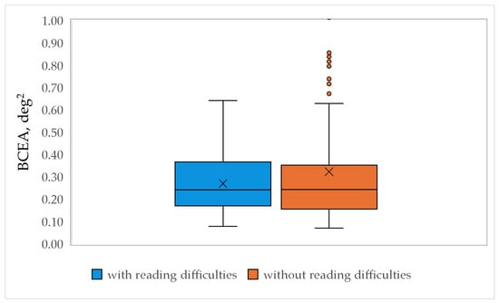 Binocular fixation stability in children with and without reading difficulties. Box plots represent interquartile range; crosses indicate the mean values, and lines indicate the medians.