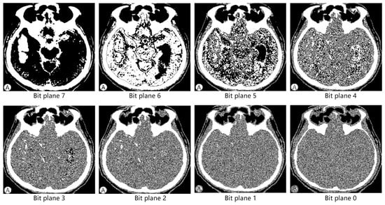 For example, the binary representation of a pixel value of 206 is 11001110, which has a value of one in Bit Plane 7, one in Bit Plane 6, …, and zero in Bit Plane 0. P performs a bit plane decomposition into eight binary bit planes , each bit plane is formed by the ith bit of all pixels in the image. To visualize the information distribution in each bit plane more intuitively, we chose a CT image of the brain and decomposed it into 8-bit planes. Figure 2 shows the image information contained in each bit plane from high to low. It can be visualized that the high-bit planes hold a majority of the contour and structural information. The low-bit plane is barely visible as edges and contours and contains more detail and noise. The properties of the bit plane have led to extensive applications across multiple image processing domains. In image compression, image size can be reduced by selective compression based on the importance of the bit planes []. In image enhancement, the processing of the special localization plane allows targeted adjustment of the contrast, brightness, and other features of the image []. In image encryption, the transformation of specific bit planes enables secure protection of the image content by encrypting the pixel values within those planes using advanced cryptographic algorithms []. In digital watermarking, by selecting appropriate positions and methods to embed watermark information in bit planes, the function of copyright protection can be achieved without interfering with the normal visual effects of the image []. Usually, the lower bit planes are chosen to embed watermarks because the slight changes in the lower bit planes have no significant impact on the visual quality of the image. Overall, the analysis of the bit plane helps to deeply understand the inner structure of the image, providing new perspectives and methods for image processing.