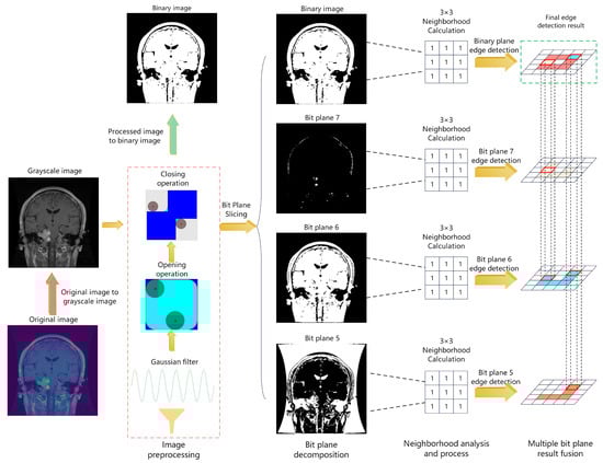 The grayscale image’s pixels can be regarded as binary values ranging from 0 to 255. A normal grayscale image consists of 8-bit planes. The three MSB planes of the image are rich in the main contour information and have a natural advantage for extracting the image edges, while the five LSB planes are rich in the details of the image and are not conducive to highlighting the global structure of the image. Based on the properties of bit planes, the CIED takes advantage of the three MSB planes. Figure 3 illustrates the demonstration of the CIED. The CIED includes four main steps: image preprocessing, grayscale image bit plane decomposition, 3 × 3 neighborhood analysis and process, and edge detection result fusion.