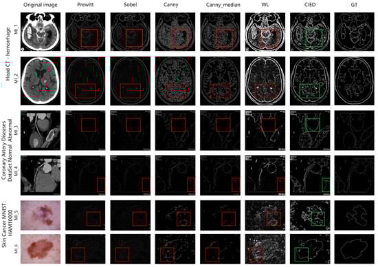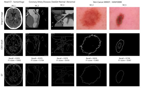Due to the unique characteristic of contrast invariance in the CIED, it aims to deal with different types of medical images under different contrast conditions. The existing public medical image datasets can hardly cover such diverse and targeted image samples comprehensively, and thus cannot fully validate the effect of this characteristic. Therefore, to comprehensively assess the performance of the CIED, we develop a Medical Image Edge Detection Test (MIEDT) dataset. The MIEDT includes 100 medical images randomly chosen from three publicly available datasets: Head CT-hemorrhage [], Coronary Artery Diseases DataSet (https://www.kaggle.com/datasets/younesselbrag/coronary-artery-diseaes-dataset-normal-abnormal (accessed on 6 January 2023)), and Skin Cancer MNIST: HAM10000 []. In addition, we label the ground truth (GT) with the assistance of experienced physicians. We make many modifications based on the physician’s recommendations. Through repeated confirmations, we finally obtain the GT that meets the actual needs. The MIEDT consists of 15 head CT images, 25 coronary artery disease images, and 60 skin lesion images. In MIEDT, the head CT images demonstrate high contrast due to the significant difference in the absorption of X-rays into tissues of different densities. The coronary artery images are acquired by CT angiography, which has low contrast, as it is characterized by subtle tissue differences. The skin images rely on optical imaging and exhibit the lowest contrast because they capture surface features and color changes. Since these medical images have different contrast and imaging modalities, the MIEDT has the capacity to comprehensively assess the performance of the edge detection algorithm. The MIEDT has been released on Kaggle (https://www.kaggle.com/datasets/lidang78/miedt-dataset (accessed on 12 January 2025)). The MIEDT is continuously updated and maintained.