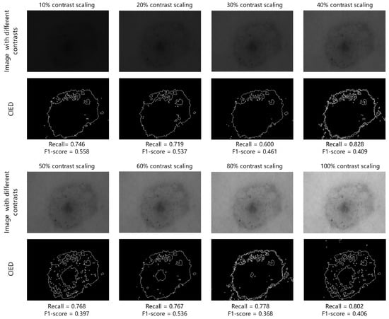 In addition to visual and quantitative evaluations, we also evaluated the contrast-invariant robustness of CIED. To verify the contrast-invariant of CIED, we linearly scaled the contrast of the image to different degrees, and then we used CIED for these images separately. Figure 7 shows the visual effect of the CIED at different contrasts from 10% to 100%. Rows 1, 3 of Figure 7 are medical images at different contrasts and Rows 2, 4 of Figure 7 are CIED edge detection results at different contrasts. In addition, Figure 7 shows the recall and F1-score at various contrast levels. From Rows 1 and 3 of Figure 7, it can be observed that when the contrast is only 10%, the image is barely visible. As the contrast gradually increases, the image becomes clearer and clearer. From Rows 2, 4 of Figure 7, it can be observed that CIED can identify edges clearly even when the contrast of the image is only 10%. With the gradual increase in contrast, CIED’s edge detection visualization has been relatively stable and able to extract complete and clear edges. From the result of Figure 7, the recall of CIED is always high, almost always above 0.7. This indicates that CIED can extract the edges effectively in different contrasts. Especially in the case of low contrast, for example, in the contrast of only 10%, its edge detection results of recall can also reach 0.746. Due to the low contrast instead of reducing part of the noise interference, the performance of the F1-score reaches 0.558.
