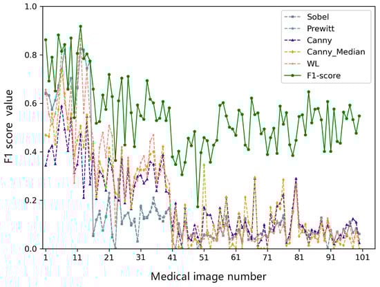 To further quantitatively analyze the edge detection methods, we also utilize accuracy, precision, recall, and F1-score to evaluate the performance of edge detection comprehensively. Table 2 shows the average metric results for different methods. The evaluation metric results of the CIED are indicated in italics, while the optimal values are highlighted in bold. The CIED method attained the highest average accuracy of 0.978, average precision of 0.408, average recall of 0.917, and average F1-score of 0.550 among all methods. These results indicate that CIED performs well. It shows that CIED can efficiently detect most target edges while balancing the corresponding accuracy. On the other hand, the CIED can reduce edge omissions when dealing with low-contrast medical images. As the F1-score is an evaluation metric integrating both precision and recall, it gives a more balanced reflection of the performance of edge detection results. Figure 9 shows the result of the detected edge images using different methods in terms of F1-score. According to the result, CIED performs the best and most stably among these methods. Some methods can hardly detect any edges under low contrast, resulting in an F1-score close to zero, whereas CIED can still robustly extract effective edge information.