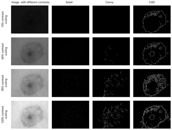 The comparison result of detected edge images at different contrast levels using Sobel, Canny, and the CIED.