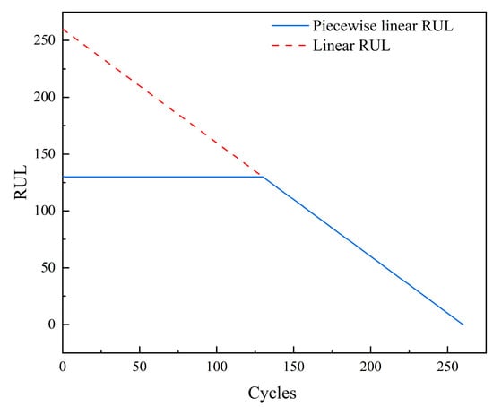 Taking into account that the operation data of the aero-engine manifest as a long time series, during the initial stage of operation, the engine performance remains relatively stable, and the degradation trend of the performance is not overly evident. Hence, it can be postulated that the value of the engine’s remaining useful life (RUL) will be maintained as a constant value within this specific period of time. When the operating time continuously increases and reaches the critical value , the wear and tear of the components can no longer be overlooked. At this juncture, the remaining service life of the engine gradually diminishes along with the wear and aging of the hardware. Its RUL objective function is depicted in Figure 9.