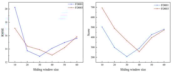 Figure 11 illustrates the impact of the sliding time window size within the aero-engine remaining life prediction model. As the window length expanded, the prediction effect gradually enhanced. However, when the window length surpassed 30 for the FD001 dataset and 40 for the FD003 dataset, the prediction performance exhibited a downward trend. Based on this finding, we opted to set the time window lengths of FD001 and FD003 to 30 and 40, respectively, thereby ensuring that the model attains high accuracy in predicting the remaining life of the aero-engine.