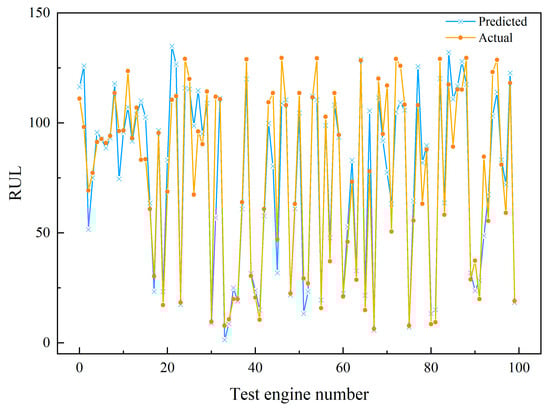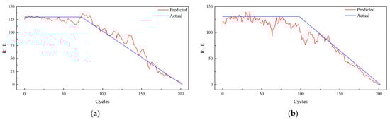 The optimal model was employed to conduct tests on the FD001 and FD003 datasets, and its prediction results are presented in the following section. Additionally, for the purpose of attaining a more comprehensive understanding of the predicted engine degradation process, two engines were randomly chosen from each of the two sub-datasets, namely FD001 and FD003, to carry out engine prediction as well as the visualization and analysis of the actual degradation process. The results are displayed in Figure 12, Figure 13 and Figure 14.