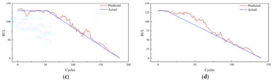 Predicted results of the engine degradation process. (a) Unit #31 in FD001. (b) Unit #64n FD001. (c) Unit #57 in FD003. (d) Unit #70 in FD003.