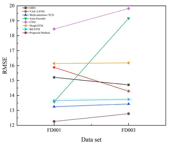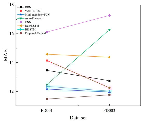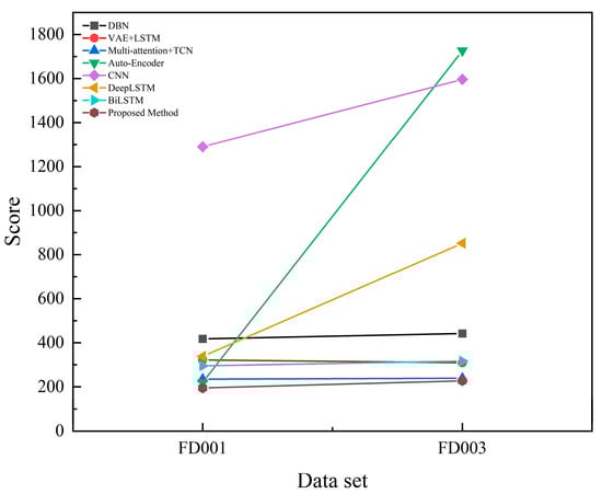 Figure 15, Figure 16 and Figure 17 display a comparison of the results of the evaluation criteria under different methods. Observing these figures shows that the various network models attained good prediction results for the FD001 and FD003 datasets. Additionally, the remaining useful life (RUL) prediction model proposed in this chapter exhibited a significant improvement in prediction performance in comparison to the other network models. Concerning the prediction results for the FD001 dataset, when compared to the multi-attention + TCN method, which had the lowest mean absolute error (MAE) and root-mean-square error (RMSE), the MAE of the proposed method was reduced by 5.67%, the RMSE and Score of the proposed method were reduced by 7.47% and 17.02%, respectively. When contrasted with the Auto-Encoder method, which had the lowest Score, the MAE was reduced by 8.09%, the RMSE and Score decreased by 9.72% and 11.36%, respectively. As for the prediction results for FD003, in comparison to the multi-attention + TCN method, which exhibited the lowest MAE, RMSE, and Score, the MAE, RMSE, and Score of the proposed method were reduced by 1.67%, 4.84%, and 5.02%, respectively. The results of the two evaluation indexes, namely the MAE, RMSE, and Score, demonstrate that the prediction results of the method proposed in this paper are superior.