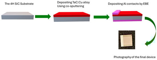 This section describes the fabrication process of the TaC: Cu/4H SiC photodetector. The n-type 4H SiC substrate, with a doping level of 1 × 1018 cm−3, a thickness of 350 µm, and dimensions of 10 mm × 10 mm, was procured from MSE Supplies (Tucson, AZ, USA). High-purity tantalum carbide (TaC) with a 2:1 atomic ratio and copper (Cu) targets, each with 99.9% purity and a 4-inch diameter, were acquired from Loyal Target Tech. Prior to deposition, the 4H SiC sample underwent rigorous cleaning to eliminate surface contamination and native oxides. This involved the immersion of the 4H SiC substrate in an ultrasonic bath with acetone and deionized water for twenty minutes, followed by treatment with buffered oxide etchant. The cleaned substrate was then dried using high-purity nitrogen gas.