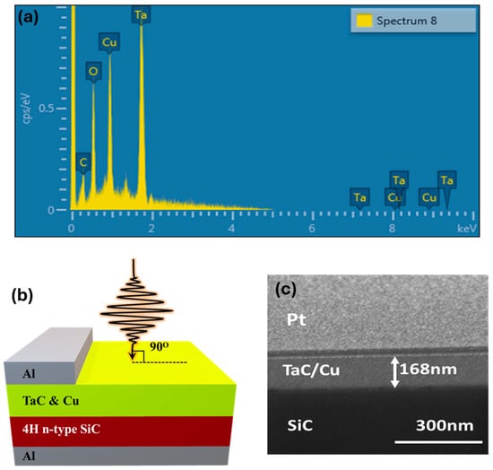 The deposition rate and film thickness of the TaC: Cu alloy on the glass substrate were measured using a Dektak (Bruker Corporation, Hillsboro, OR, USA) surface profiler, ensuring a precise assessment of material growth. Surface morphology analysis was conducted with a scanning electron microscope (SEM, FEI Verios) at a working distance of 5 mm, with operating voltages ranging from 5 kV to 15 kV. The elemental composition was evaluated through energy-dispersive X-ray spectroscopy (EDX), utilizing an Oxford INCA X-act detector integrated within the SEM system. To investigate the cross-sectional architecture of the fabricated photodetector (TaC: Cu/4H-SiC), a focused ion beam (FIB) system (FEI Helios 600 NanoLab (FEI, Hillsboro, OR, USA)) was employed. This advanced tool, featuring high-resolution SEM imaging (0.9 nm) and ion beam capabilities, enabled detailed observation of the film’s cross-sectional morphology.