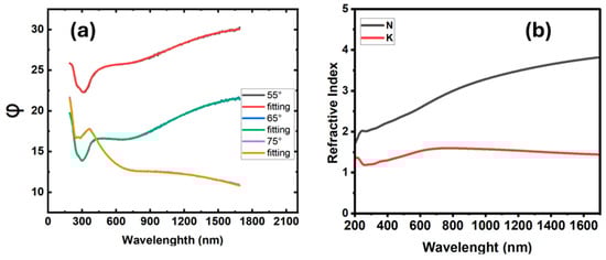 The dielectric function (ψ) of the TaC: Cu film was characterized using variable-angle spectroscopic ellipsometry (VASE) over a spectral range from 200 nm to 1800 nm. Measurements were conducted at three distinct incident angles (55°, 65°, and 75°), and the resulting data were analyzed using a general oscillator model. The excellent agreement between the experimental data and the model-generated results, as illustrated in Figure 4a, validates the accuracy and reliability of the measurements. Furthermore, spectroscopic ellipsometry (SE) was performed over the same wavelength range, with a step size of 2 nm, to determine the optical constants of the TaC: Cu alloy. The analysis assumed a single uniform layer and ignored the surface roughness.