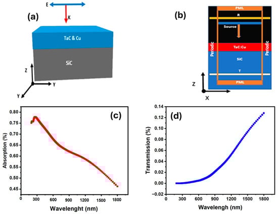(a) The schematic structure of the TaC: C/4H SiC hybrid structure. (b) The FDTD simulation region used to simulate the optical absorption and transmittance of the TaC: Cu alloy on SiC. (c,d) The simulated optical absorption and transmission as a function of the wavelength for the TaC: Cu alloy on SiC, respectively.
