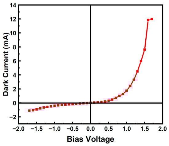 The performance of the photoresponse device was evaluated through its current–voltage (I-V) characteristics. Figure 6 illustrates the variation in dark current with applied voltage. In the reverse bias region, the dark current increases exponentially as the voltage rises from −1.75 V to 0 V. When the bias voltage shifts to the positive range (forward bias), the current shows a rapid exponential growth from 0 V to 1.75 V.