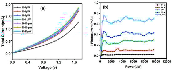 Figure 7a shows the relationship between the total current and applied bias voltage at different light intensities. It reveals that the total photocurrent increases linearly with light intensity under reverse bias. Furthermore, the relationship between photocurrent and light power at a reverse voltage is depicted in Figure 7b. The photocurrent initially grows linearly with increasing light power but reaches a saturation point beyond 400 µW, after which no significant increase is observed.