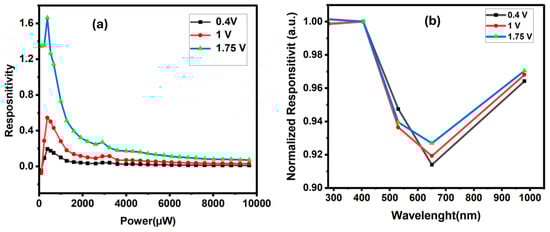 where denotes the illuminated current, represents the dark current, and stands for the incident optical power. Figure 8a illustrates the relationship between responsivity and incident optical power. The responsivity exhibits significant variation with changes in incident power. Initially, it increases with rising incident power and stabilizes at approximately 380 µW. Beyond this threshold, the responsivity decreases sharply as the incident power continues to rise. This behavior is attributed to the saturation of the photocurrent at higher power levels, which reduces the responsivity. The measured responsivity values at applied voltages of 0.4 V, 1 V, and 1.75 V were 0.195, 0.544, and 1.66 A/W, respectively. Figure 8b presents the normalized responsivity of the photodetector across different wavelengths. The normalized responsivity was measured using four LED sources and relatively normalized to the responsivity at 405 nm. The graph includes three curves corresponding to different applied voltages: the black line for 0.4 V, the red line for 1 V, and the blue line for 1.75 V. The responsivity reaches its peak value of 1 at 405 nm and gradually decreases to 0.915 at 650 nm.