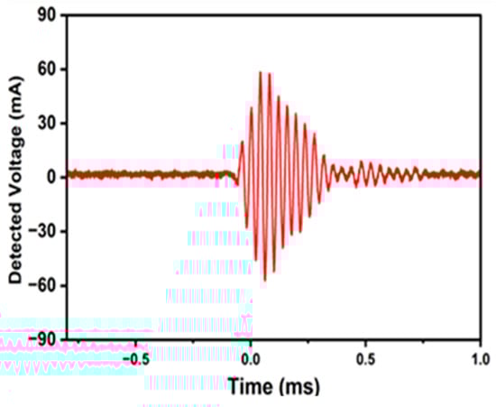 To evaluate the time response of the device, a Q-switched laser source with a peak power of 1500 W, a pulse duration of 10 ns, and a repetition rate of 1 kHz was employed. An optical attenuator was utilized to decrease the average beam power to 1 mW. Under these conditions, with a beam diameter of 2 mm, the resulting response spectrum is depicted in Figure 9. The envelope of the pulse oscillation spans approximately 260.7 µs. The response time was determined using the following formula []: