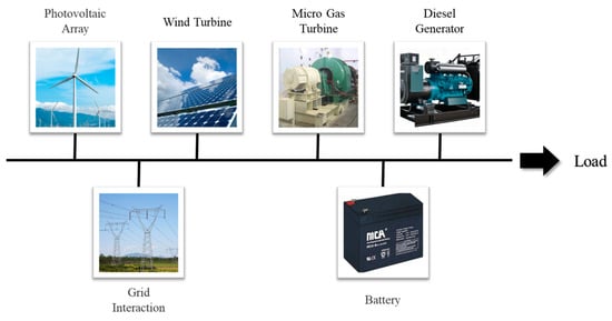 MG is a small power-generation and distribution system composed of distributed generations (DGs), Battery Energy Storage Systems (BESSs), and loads. Fossil-energy-generation units, such as diesel generators (DEs) and micro gas turbines (MTs), together with RE-generation units, such as wind turbines (WTs) and photovoltaic panels (PVs), collectively form the DGs. They operate collaboratively to provide a reliable power supply []. MG was proposed to achieve flexible and efficient use of distributed energy sources and to address the challenge of integrating DGs into the grid. The development and promotion of MG can greatly advance the integration of fossil and RE, ensuring a highly reliable energy supply to loads in multiple forms. This is an effective way to transition from traditional grids to smart grids. The scale of distributed RE generation is expanding, and its role in MG is becoming prominent.