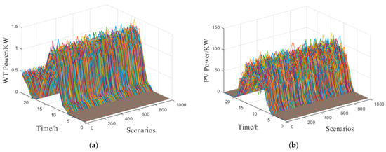 Based on the wind speed and solar irradiance data, daily distribution curves with equal probabilities can be obtained. These curves accurately characterize the uncertainty of wind and solar power. Using the wind speed and solar irradiance data from a specific day at the School of Electrical and Information Engineering, Beijing University of Civil Engineering and Architecture, Monte Carlo sampling was performed. Figure 2 shows 1000 wind and solar output scenarios generated using Monte Carlo sampling, where different colors show the different scenarios.