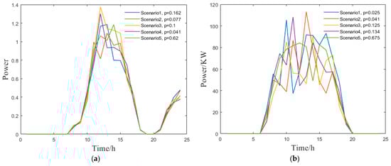 The number of clusters is important in scenario reduction algorithms. Too many clusters will reduce computational efficiency, whereas too few will fail to represent the uncertainty of wind and solar power. Based on an analysis of different cluster numbers, 1000 wind and solar output scenarios generated through Monte Carlo sampling are reduced to five scenarios using both methods, allowing for a comprehensive comparison of their advantages and disadvantages, as shown in Figure 3 and Figure 4. The probabilities of the five scenarios after reduction are shown in Table 2.